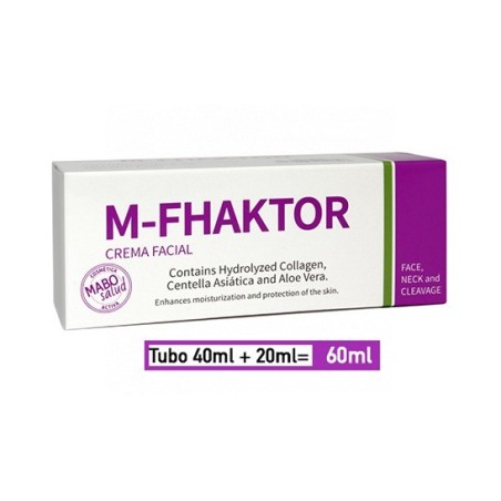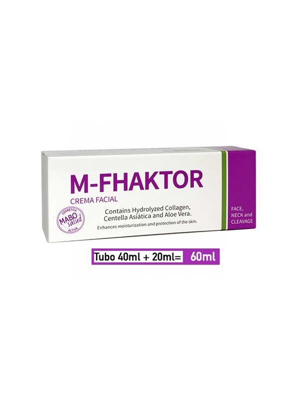 M-FHAKTOR es una crema facial con Centella Asiática (T. E. C. A), Colágeno hidrolizado y Aloe Vera que contribuye al rejuvenecimiento de la piel, ayudando a combatir las arrugas y proporcionando luminosidad a la piel. Además favorece la recuperación de las pieles reactivas al frío y al calor.