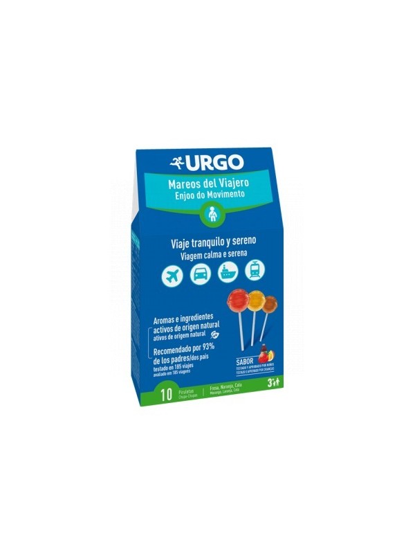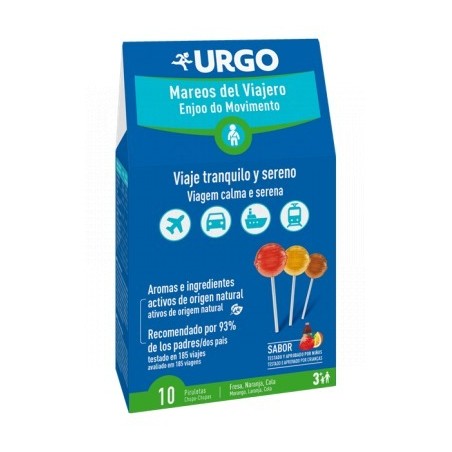 SU FORMATO EN PIRULETA ES DIVERTIDO Y PERMITE TANTO A LOS MÁS PEQUEÑOS COMO MAYORES, LLEVÁRSELO A TODAS PARTES.SU FÓRMULA EXCLUSIVA COMBINA DOS EXTRACTOS PLANTAS DE RECONOCIDA ACCIÓN:– EL JENGIBRE, QUE CONTRIBUYE AL BIENESTAR DURANTE LOS VIAJES– DIENTE DE LEÓN, QUE FAVORECE LA BUENA DIGESTIÓNNO PROVOCA SOMNOLENCIA*UN ESTUDIO REALIZADO SOBRE 58 NIÑOS QUE SUFREN MAREOS POR VIAJES DE FORMA HABITUAL, HA DEMOSTRADO QUE :EL 93% DE LOS ADULTOS RECOMIENDA URGO MAREOS DEL VIAJEROEL 88% DE LOS PADRES CONSIDERA QUE EL BIENESTAR DIGESTIVO DE SU HIJO HA MEJORADO.8 DE CADA 10 NIÑOS ESTÁN SATISFECHOS DESDE EL PRIMER VIAJE.MODO DE EMPLEO:SE DEBE TOMAR ENTRE 30 MINUTOS Y 1 HORA ANTES DEL INICIO DEL VIAJE.PARA UN TRAYECTO LARGO, SE PUEDE TOMAR HASTA 3 VECES LA DÍA.URGO MAREOS DEL VIAJERO SE PUEDE TOMAR A PARTIR DE LOS 3 AÑOS, BAJO LA SUPERVISIÓN UN ADULTO.PRECAUCIONES DE EMPLEO:MANTENER FUERA DEL ALCANCE DE LOS NIÑOS.NO DEBE UTILIZARSE COMO SUSTITUTO DE UNA DIETA VARIADA Y EQUILIBRADA Y UN ESTILO DE VIDA SALUDABLE.DEBE UTILIZARSE BAJO LA SUPERVISIÓN UN ADULTO.NO RECOMENDADO PARA LAS PERSONAS ALÉRGICAS A LAS PLANTAS DE LA FAMILIA DE LOS ZINGIBERÁCEAS O A SUS COMPUESTOS.CONSERVAR EN UN LUGAR SECO Y A UNA TEMPERATURA INFERIOR A 25°C.NO TOMAR MÁS DE 3 PIRULETAS AL DÍACOMPOSICIÓNJENGIBRE Y DIENTE DE LEÓNFORMATO10 PIRULETASSABOR FRESA, NARANJA Y COLASIN LACTOSA