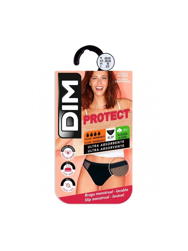 CAMBIA TUS HÁBITOS CON NUESTRAS NUEVAS BRAGAS DE FLUJO MEDIO DIM PROTECT, TU NUEVA ALTERNATIVA SALUDABLE Y CÓMODA AL 100 %TE ENCANTARÁ:SU TEJIDO INTERIOR DE ALGODÓN ORGÁNICO SÚPER SUAVE QUE RESPETA TU PIELSU DISEÑO PATENTADO GARANTIZADO ANTIFUGAS Y ANTIOLORSU NÚCLEO ABSORBENTE Y SU EXTERIOR IMPERMEABLE: SIEMPRE ESTARÁS SECASU CAPACIDAD DE ABSORCIÓN, EQUIVALENTE A LA DE 2 TAMPONESSU CORTE BÁSICO DE MUJER, DEPORTIVO Y PARA TODOSU FÁCIL CUIDADO A MÁQUINA¿UNA PROTECCIÓN EFICAZ QUE SE LLEVA COMO UNA BRAGA Y TE PERMITE ESTAR CÓMODA? ¡AHORA ES POSIBLE CON LAS BRAGAS LAVABLES DIM PROTECT! SE ACABARON LAS POSIBLES ALERGIAS, LA CONTAMINACIÓN Y LOS TABÚES, CON TUS NUEVAS BRAGAS MENSTRUALES DIM PROTECT, ¡ERES LIBRE! GRACIAS A SU ELABORACIÓN EN MATERIALES ESPECÍFICOS HIPOALERGÉNICOS, TUS BRAGAS DE ALGODÓN MENSTRUALES TE PERMITEN REALIZAR CUALQUIER ACTIVIDAD SIN MIEDO, ¡INCLUSO DEPORTE!¿TU MENSTRUACIÓN ES ABUNDANTE? ¡TAMBIÉN HEMOS PENSADO EN TI! DESCUBRE NUESTRAS BRAGAS DIM PROTET PARA FLUJO ABUNDANTE, TAMBIÉN DISPONIBLES EN FORMA DE SHORT.SI DUDAS ENTRE DOS TALLAS TE ACONSEJAMOS QUE SIEMPRE ESCOJAS LA MÁS GRANDE.93% ALGODÓN, 7% ELASTANO, 0% NULL, 0% NULLLAVAR A 30°C / NO USAR MÁQUINA SECADORA / NO BLANQUEAR / NO PLANCHAR.
