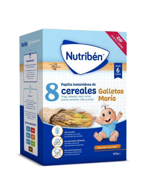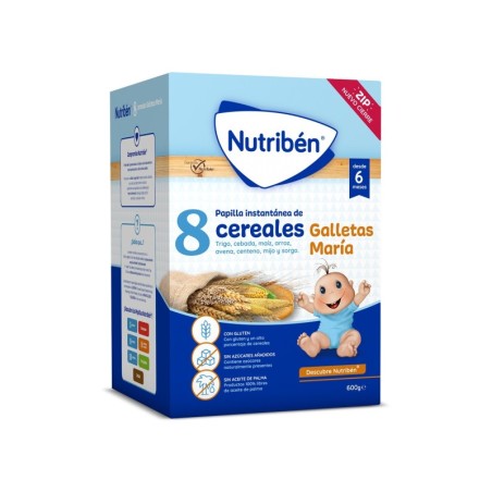 Nutribén 8 Cereales Galleta María es una papilla de cereales con un toque de miel y 4 frutas, elaborada para asegurar la alimentación del bebé a partir de los 6 meses. Es una papilla instantánea ideal para diversificar la dieta del bebé, siempre manteniendo una dieta equilibrada.